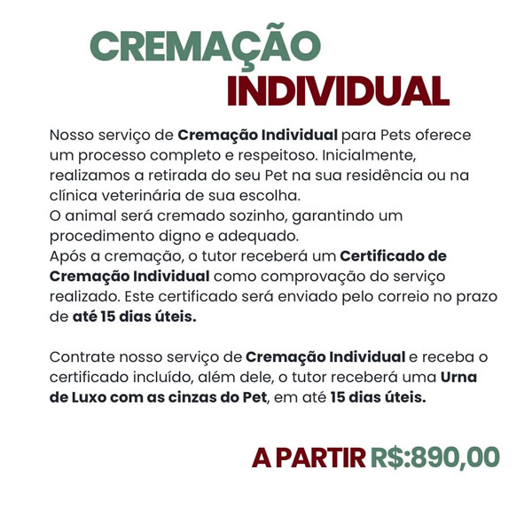 Cremação digna e respeitosa para animais de estimação. Oferecemos serviços especializados de cremação individual ou coletiva, com ou sem cerimônia de despedida, de acordo com o desejo da família.