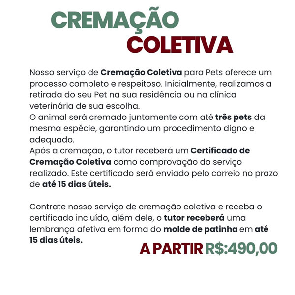 Cremação digna e respeitosa para animais de estimação. Oferecemos serviços especializados de cremação individual ou coletiva, com ou sem cerimônia de despedida, de acordo com o desejo da família.